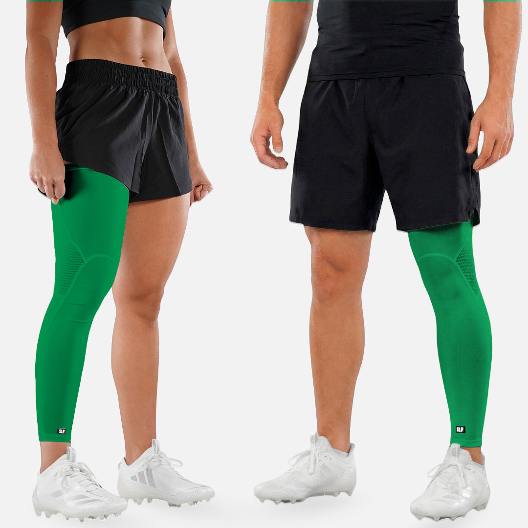 Elevate your game with the Hue Green Football Pro Leg Sleeve, designed to support your journey towards peak performance. These Recovery Pro Leg Sleeves utilise dual-fabric technology that combines a lightweight compression knit exterior with supportive panels specifically targeting your hamstrings and quads. Experience improved blood circulation and enhanced energy with every stride.